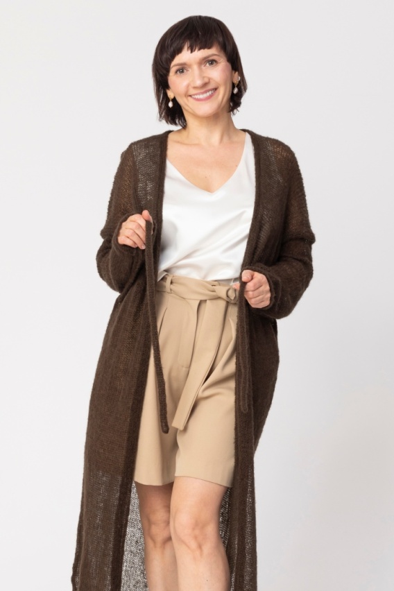 Długi kardigan wełniany z paskiem - Czekoladowy