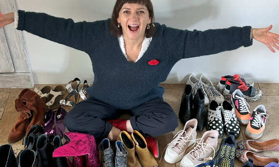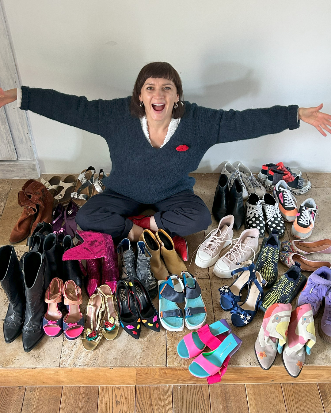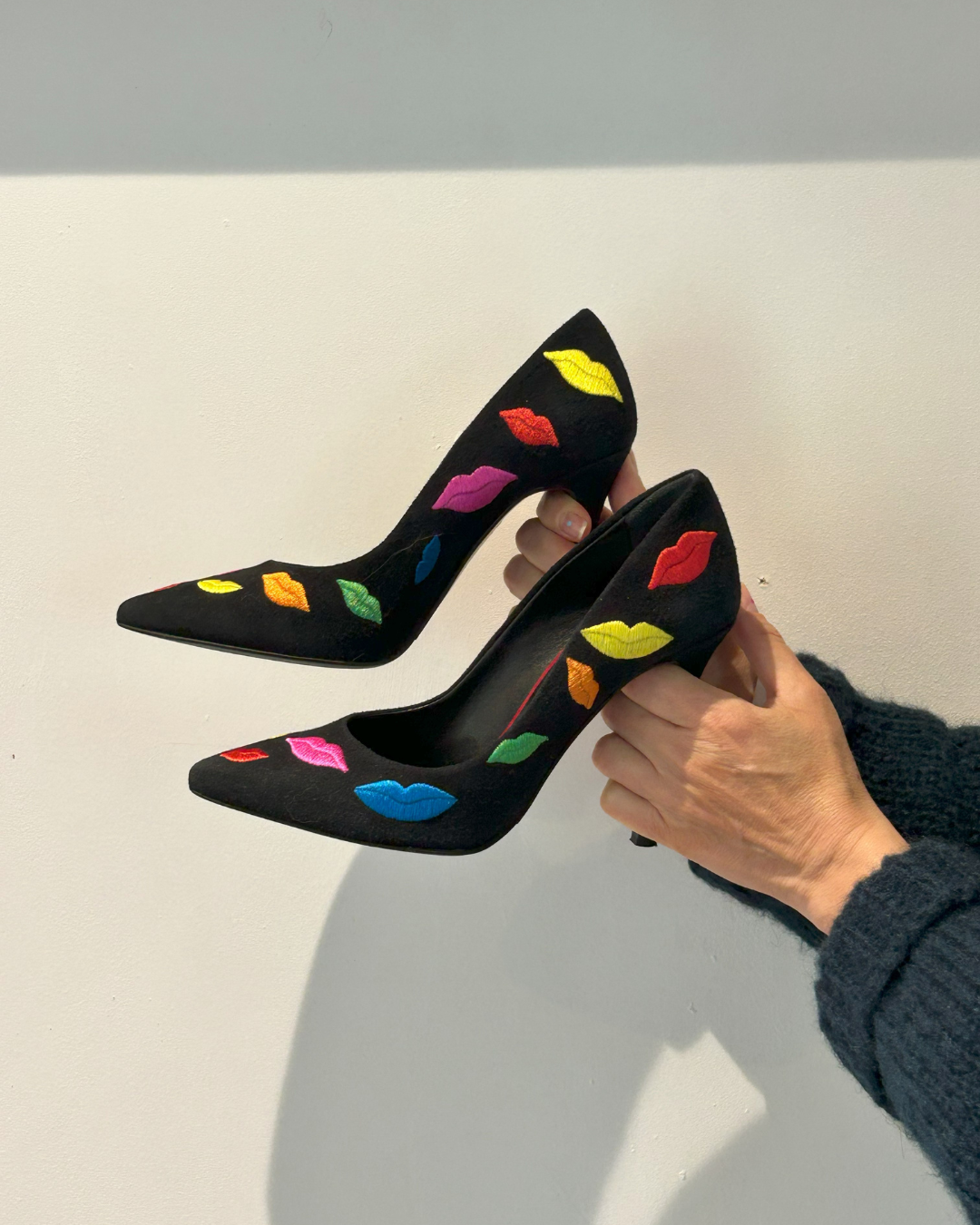 W mojej szafie mam kilka prawdziwych perełek — na przykład klasyczne czarne szpilki, ale haftowane w kolorowe usta. Albo granatowe sandałki od Maison Margiela, które z jednej strony wyglądają jak zabudowane kozaki, a z drugiej jak lekkie, ażurowe sandałki. (Kiedyś w Warszawie zaczepił mnie pan na ulicy i powiedział: "Ma pani dwa różne buty!" A ja na to: "Czy to jest zabronione?" Zdziwiony odparł, że nie… i odszedł z uśmiechem)