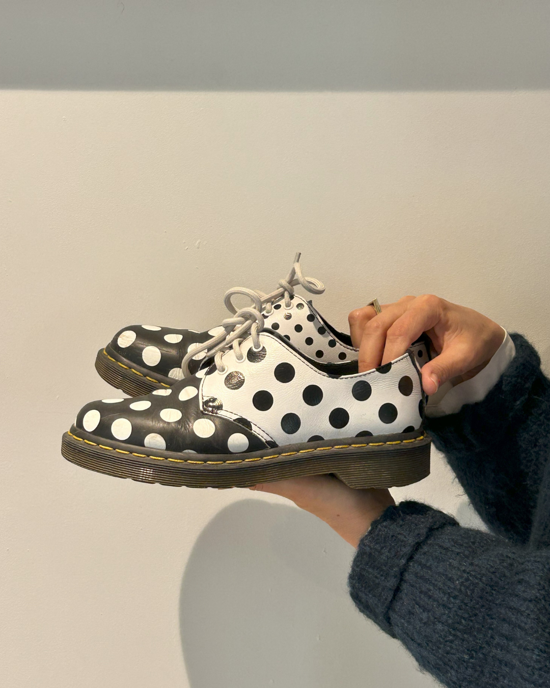 Moje flagowe buty to krótkie Martensy w kropki. Mam do nich kilka kropkowych stylizacji. Zresztą, bardzo często to właśnie od butów zaczynam kompletowanie całej stylizacji. Bo buty najtrudniej zdobyć — więc jak już mam wymarzoną parę, to dopiero potem dorabiam do niej sweter i dodatki.