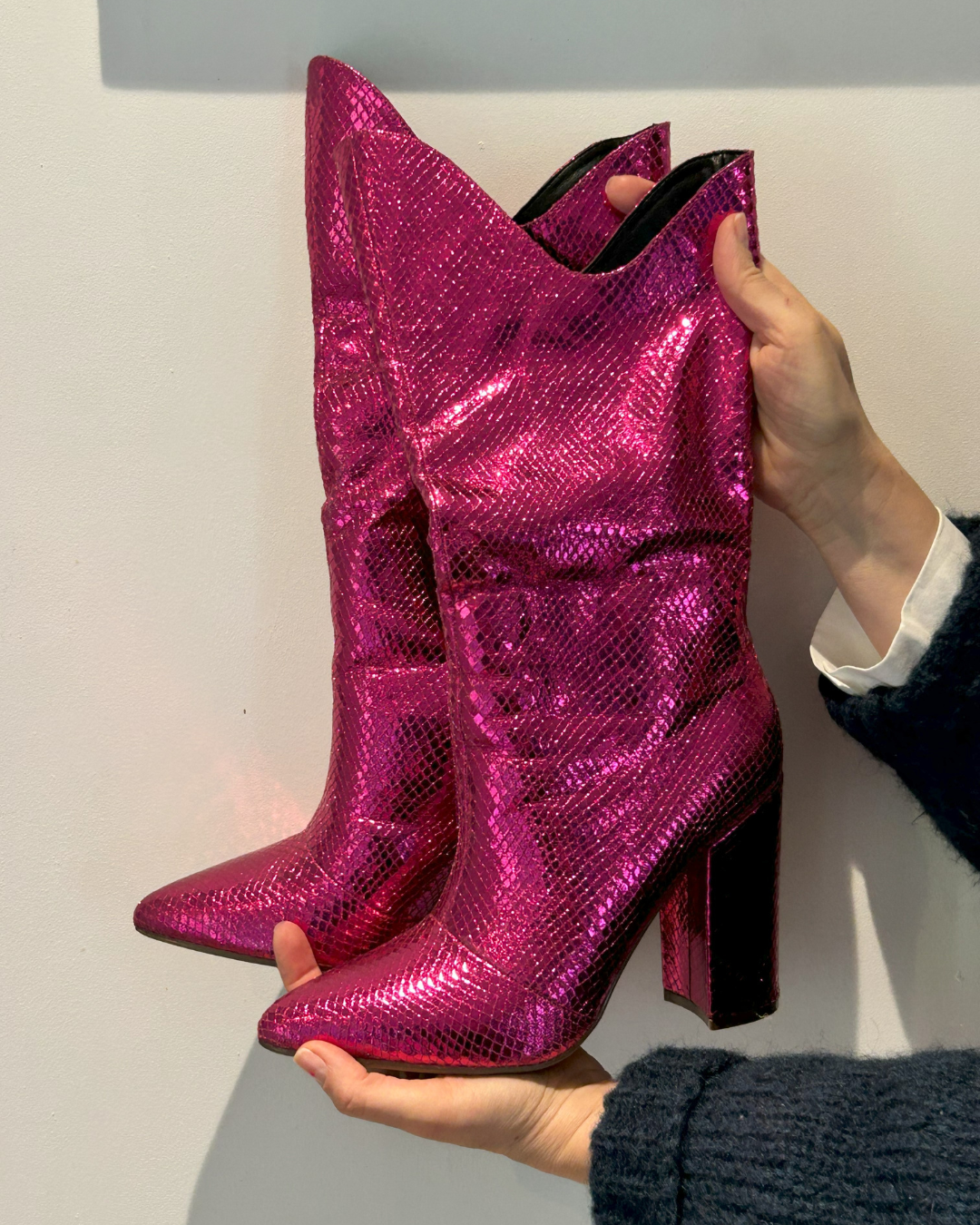 Kocham też moje fuksjowe kozaki z błyskiem — kupiłam je na otwarcie naszego atelier na Skłodowskiej i mam do nich ogromny sentyment.